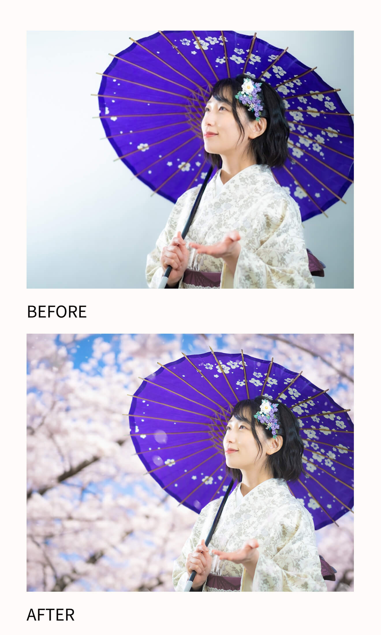 生成AIで背景を作成し、人物と馴染むように、光の色調を調整しました。また、桜が舞い落ちる様子を表現するため、ブラシツールで花びらを描き、ぼかしを加えることで静止画に動きを持たせました。